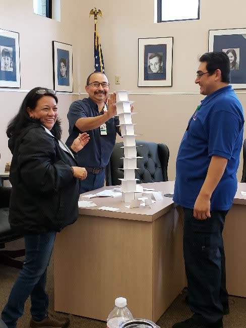 *Saturday Feb. 22 AP Science Judson HS / JH Region Band Concert *Monday Feb. 24 District Technology Committee Basketball - Boys Varsity - Bi-district playoff game vs. Mason *Thursday Feb. 27 Track & Field - Coed - Marion Track Meet 4:00 PM *Friday Feb. 28 Track & Field - Coed - Marion Junior High Track Meet Admin Alley Bud to Boss Training for New Leaders Several district supervisors in the operations department completed a 2-day Bud to Boss Workshop this week. All of the district’s business, HR, technology and operations mid-management leaders have completed this workshop. The workshop is based on a book co-authored by Kevin Eikenberry and Guy Harris titled, From Bud to Boss: Secrets to a Successful Transition to Remarkable Leadership. The 2-day training explored topics such as: · Succeeding in the Transition to Leadership · Working with Change · Becoming a Great Communicator · Coaching and Feedback · Collaborating with Others · Commitment to Success (Goal Setting) One of the many engagement activities included a team-building activity illustrated below: [Left to right] Rebecca Macal, Transportation Supervisor, Thomas Estrada, Custodial Supervisor, and Steve Ramos, Lead Custodian