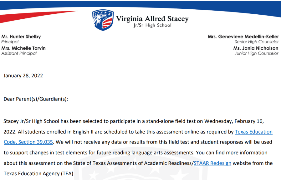 Lackland Elementary School has been selected to participate in a stand-alone field test on Tuesday, February 15, 2022. All students enrolled in 4th Grade are scheduled to take this reading assessment online as required by Texas Education Code, Section 39.035. We will not receive any data or results from this field test and student responses will be used to support changes in test elements for future reading language arts assessments. You can find more information about this assessment on the State of Texas Assessments of Academic Readiness/STAAR Redesign website from the Texas Education Agency (TEA) at tea.texas.gov.