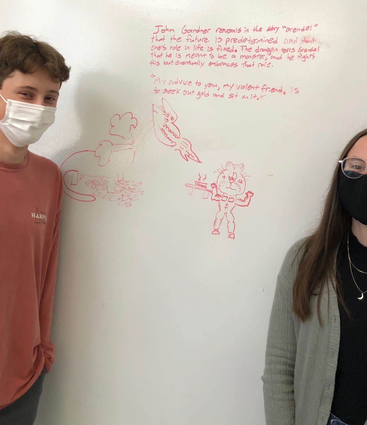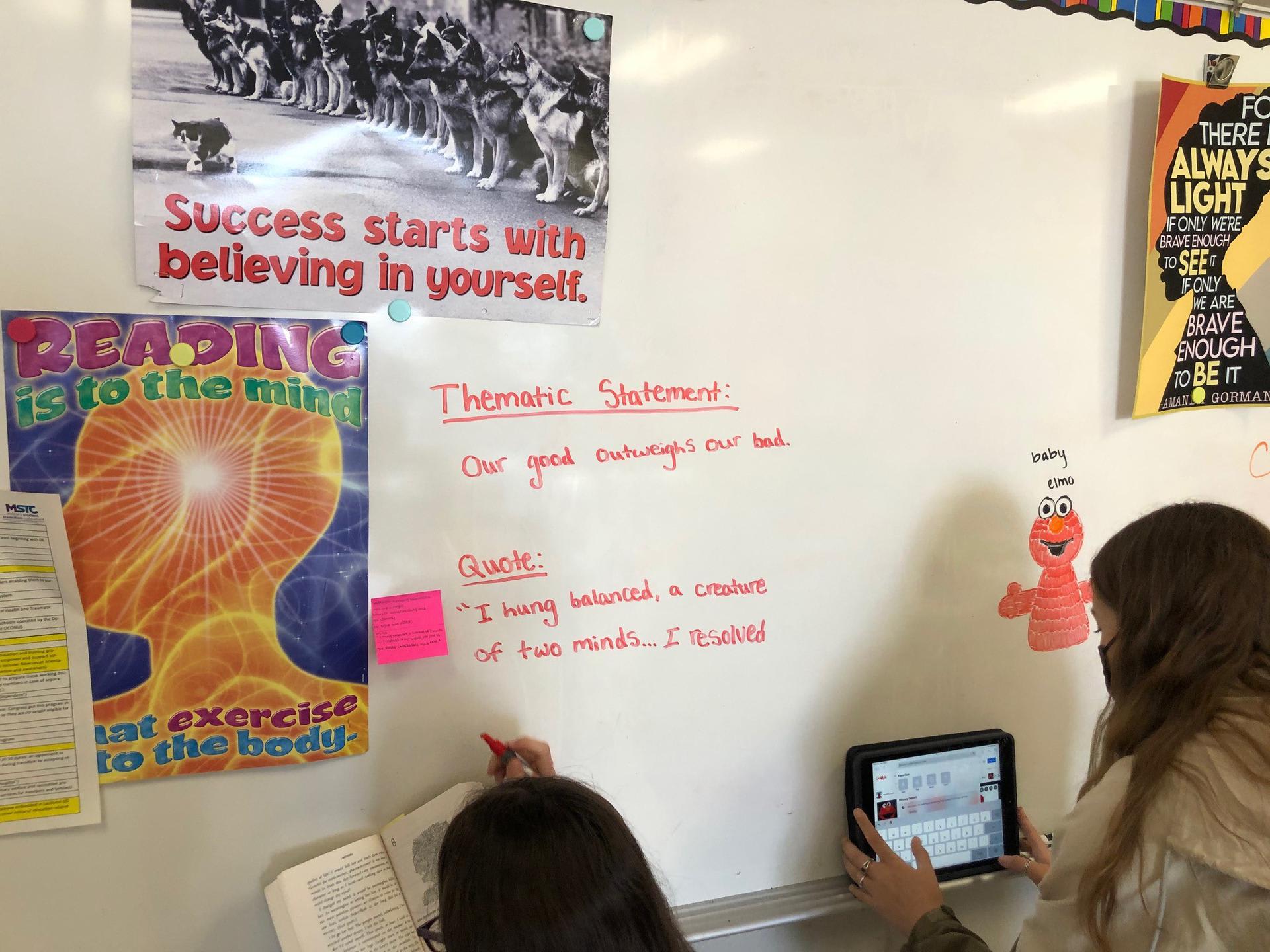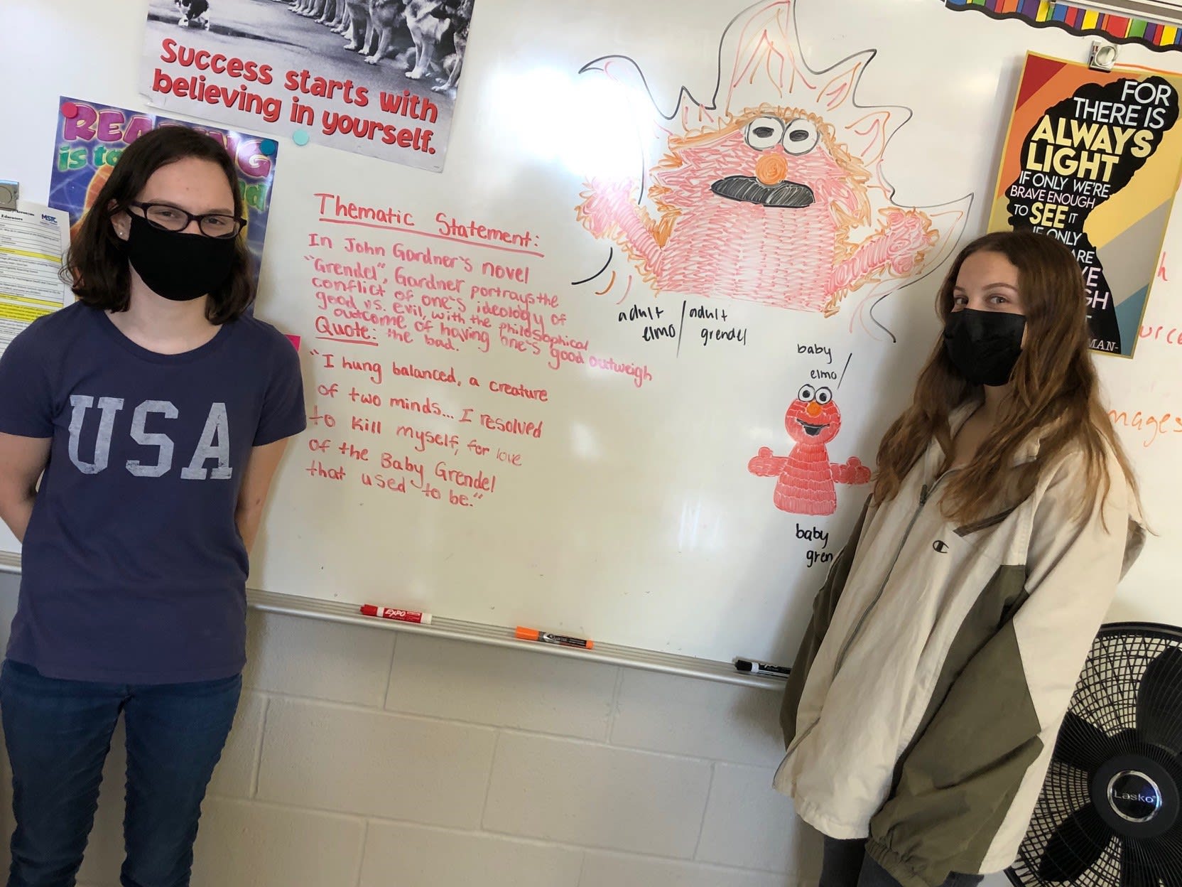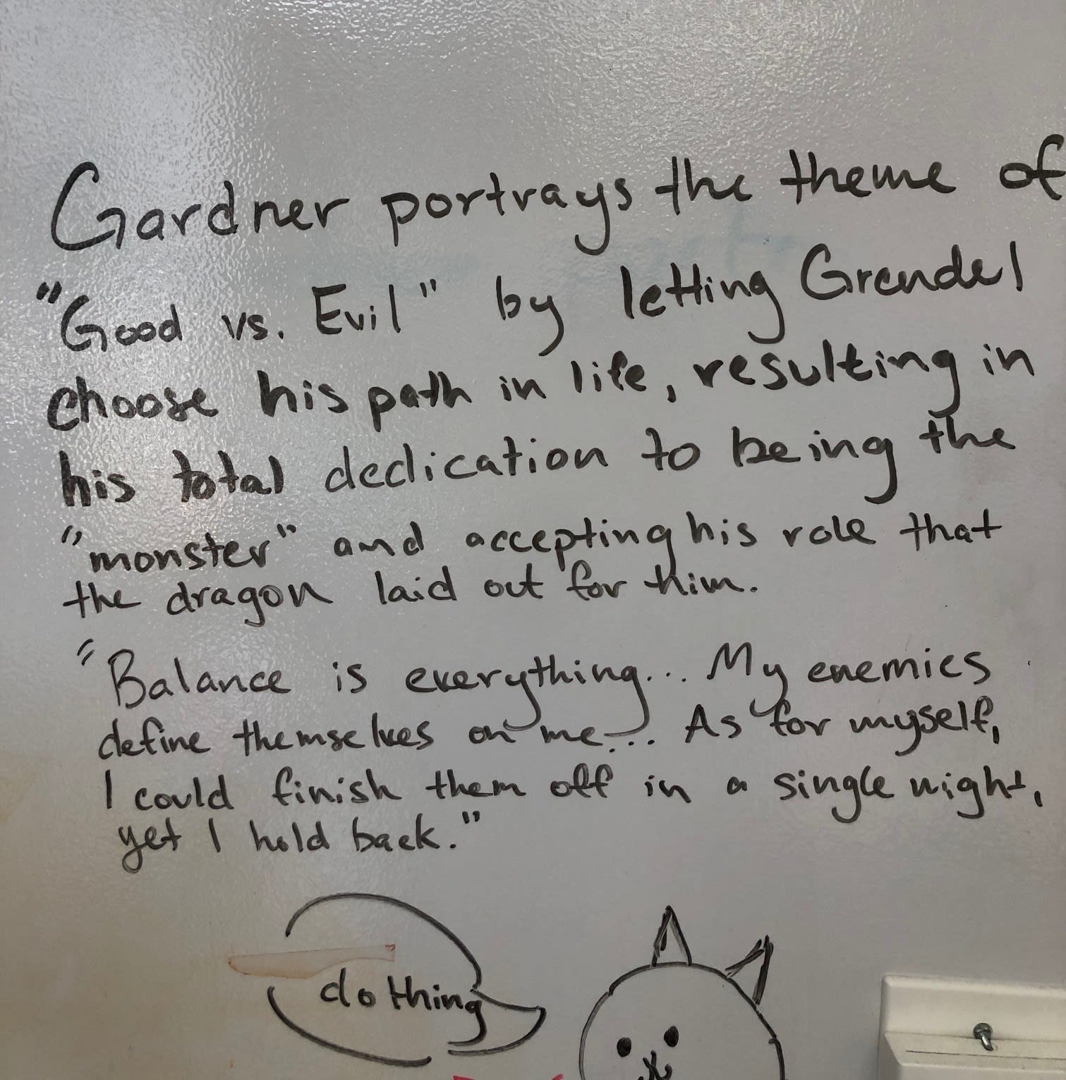 AP Literature students were given a topic from our class novel, Grendel, and asked to write a thematic statement (what do we learn about the topic). Students supported their sentence with a quote and image.  You can see they worked hard and had fun!