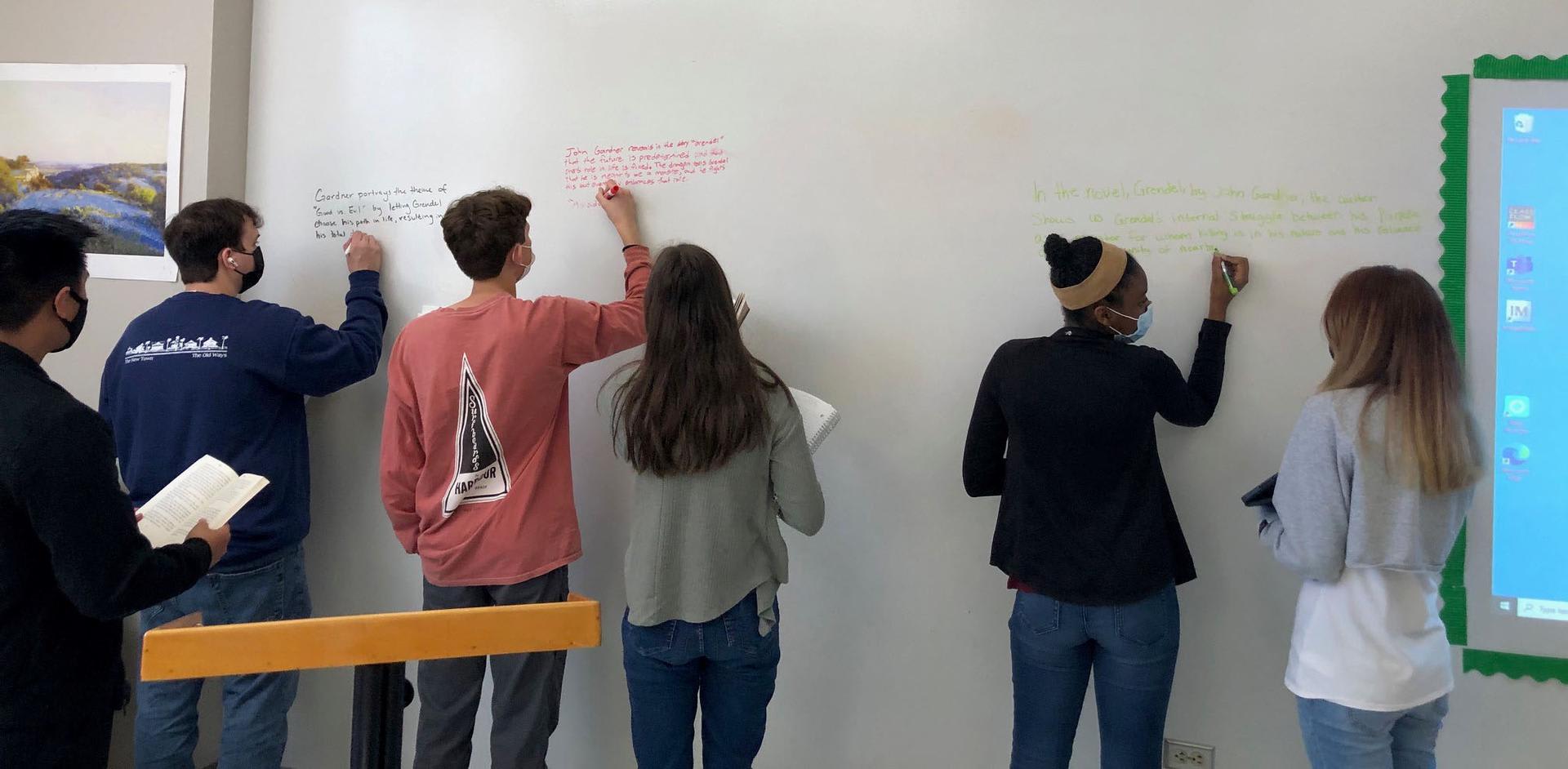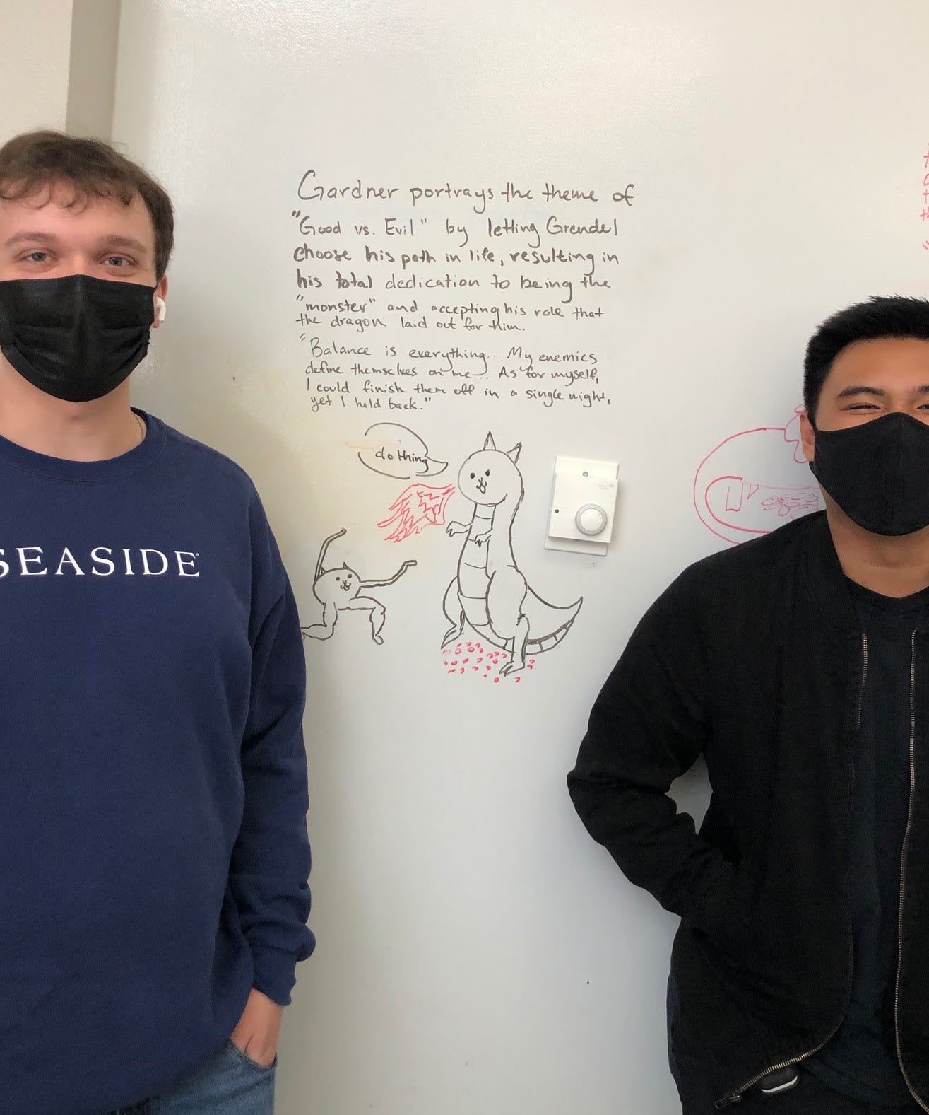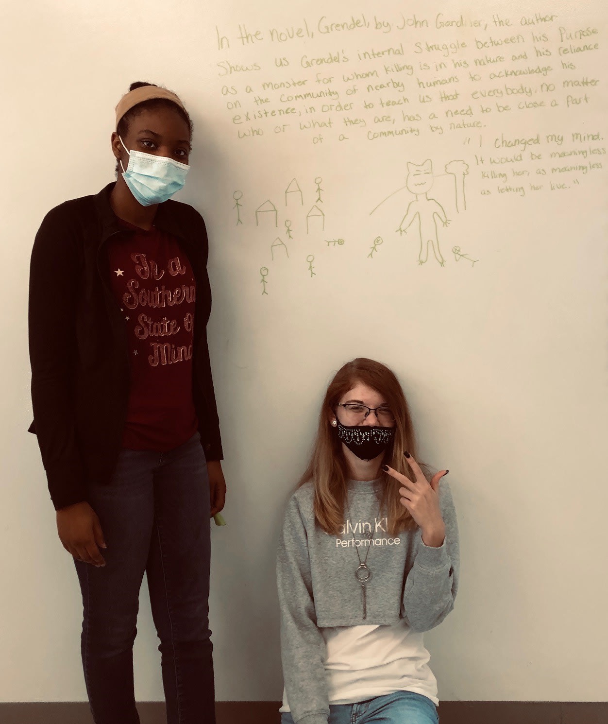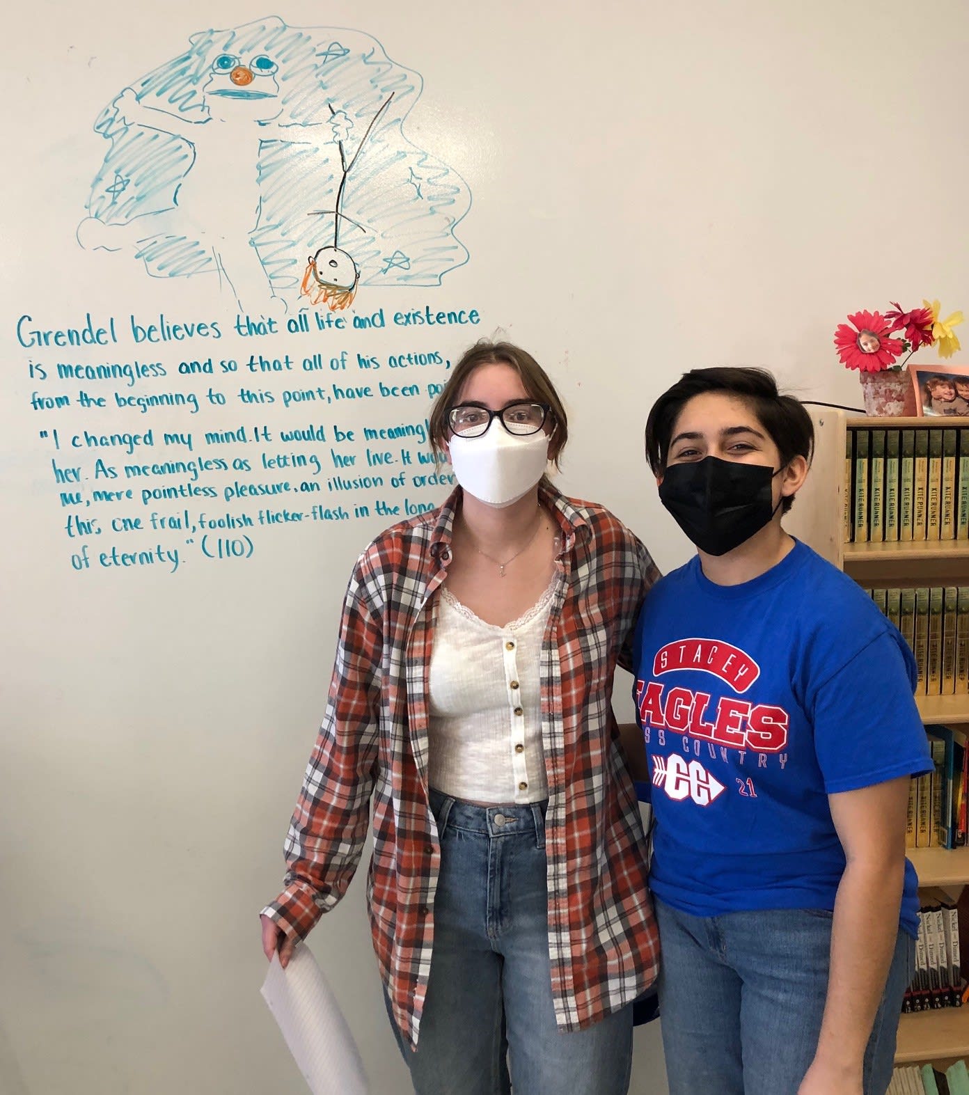 AP Literature students were given a topic from our class novel, Grendel, and asked to write a thematic statement (what do we learn about the topic). Students supported their sentence with a quote and image.  You can see they worked hard and had fun!