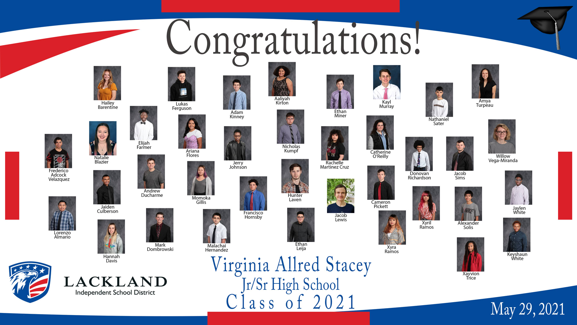Stacey Happenings Congratulations to the 2021 Class of Stacey Jr/Sr High! The graduation ceremony will be held Saturday, May 29th at the BMT Pfingston Reception Center (1800 Truemper St, here on base) Photos from the ceremony will be available for free download from the following link: https://drive.google.com/drive/folders/1fnHVWaH9UVLEsR1iLFT7fXWB3fjBnoaq?usp=sharing