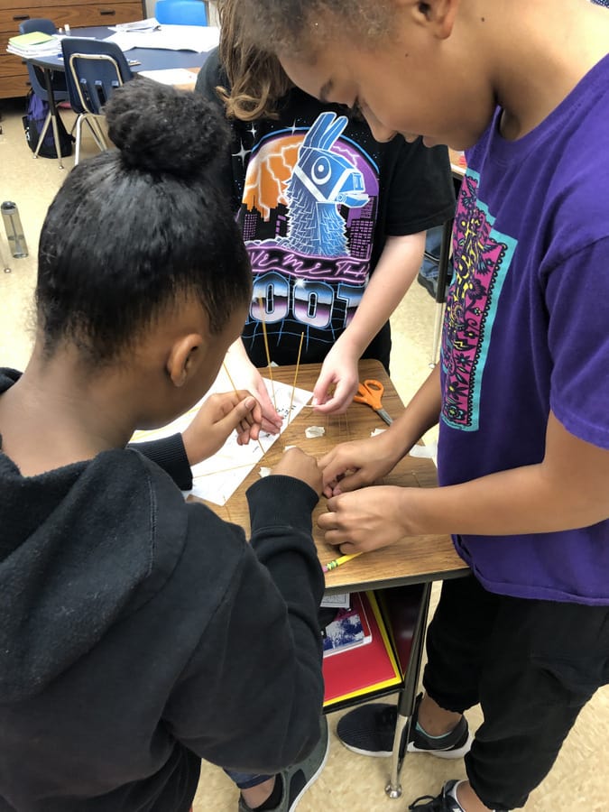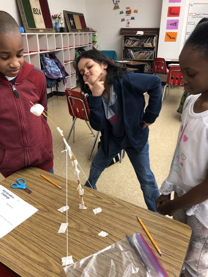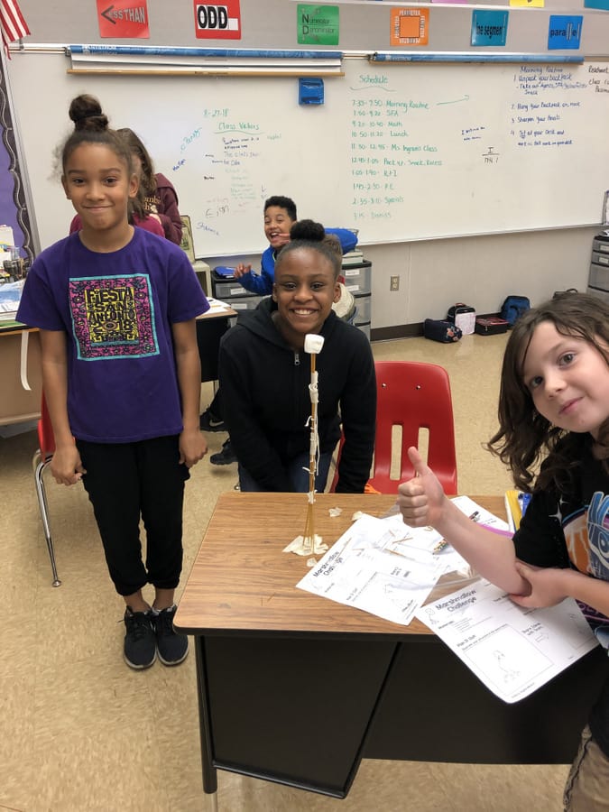 Ms. Perez’s 5-2 SFA class has a “marshmallow “ of a time team building. Students worked in a group to build the highest free standing structure with a marshmallow on top.