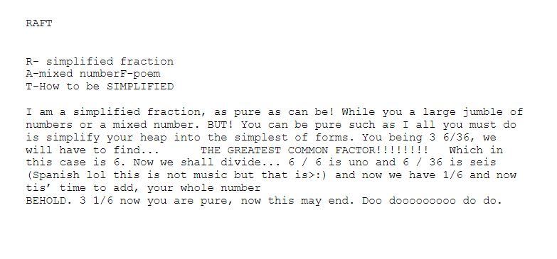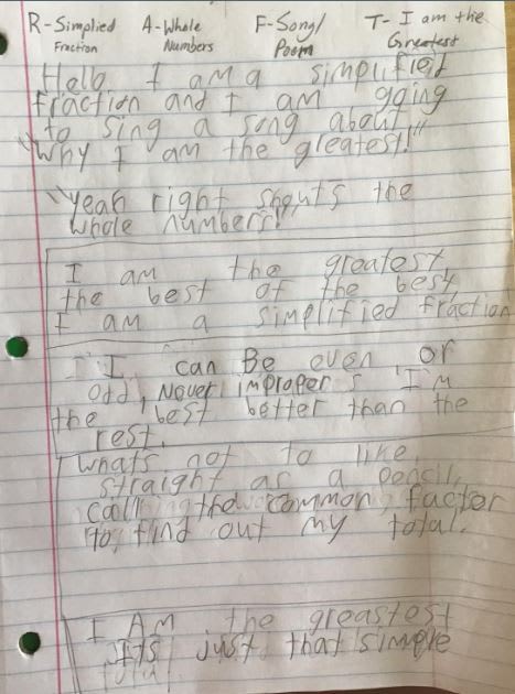Fifth grade students used a RAFT to come up with creative ways to show their understanding of Fractions. We hope you enjoy them as much as we enjoyed creating them.