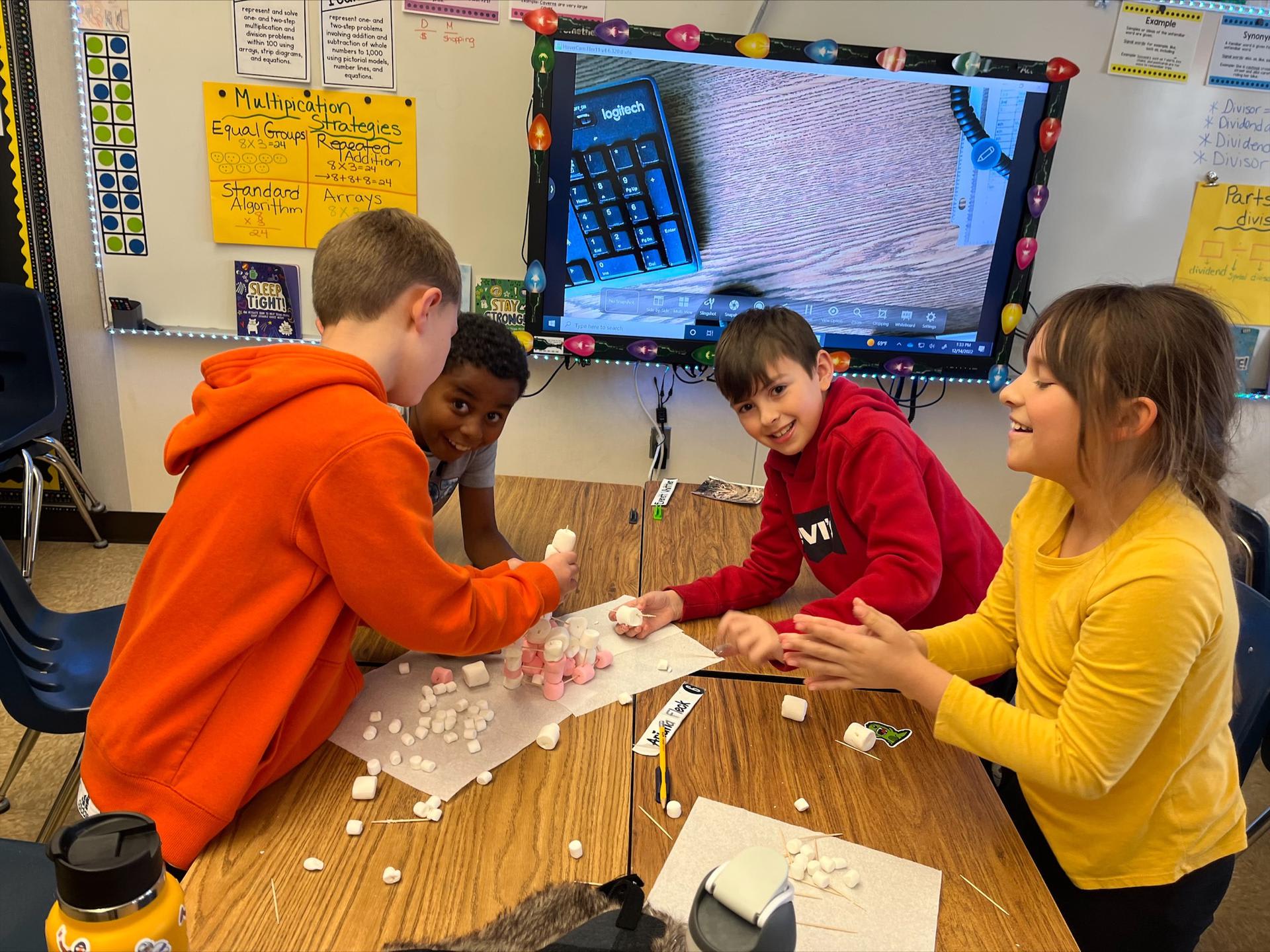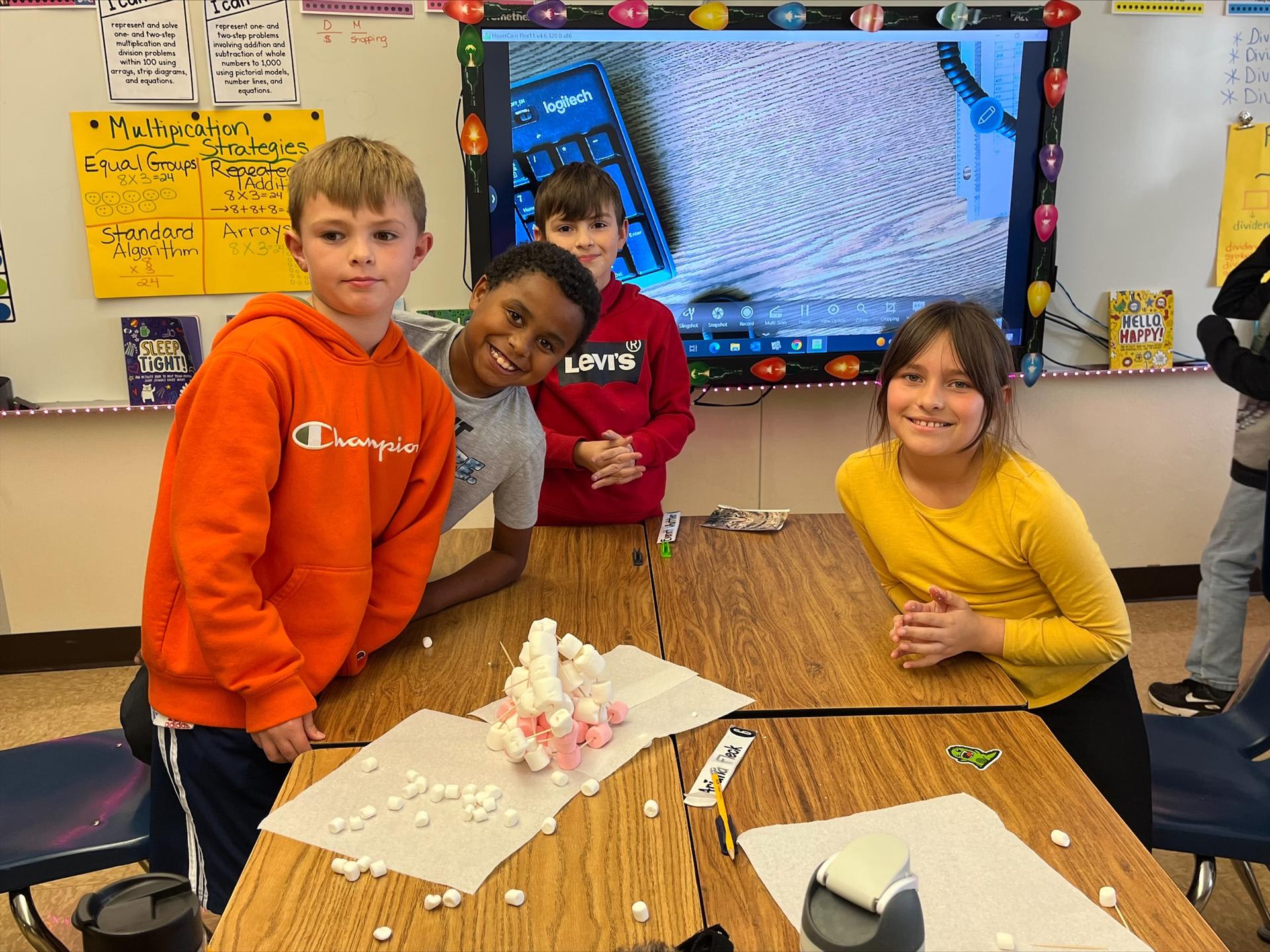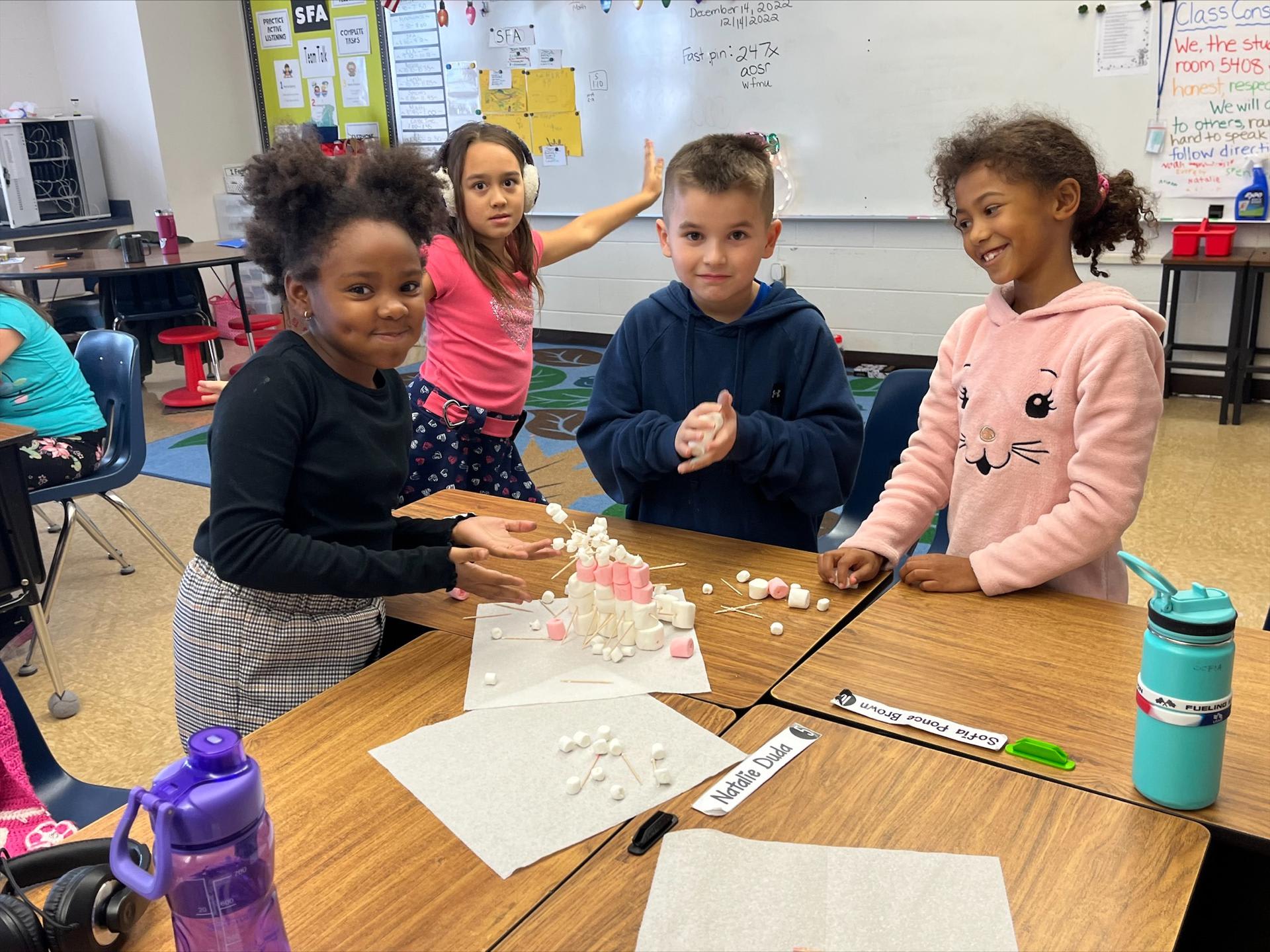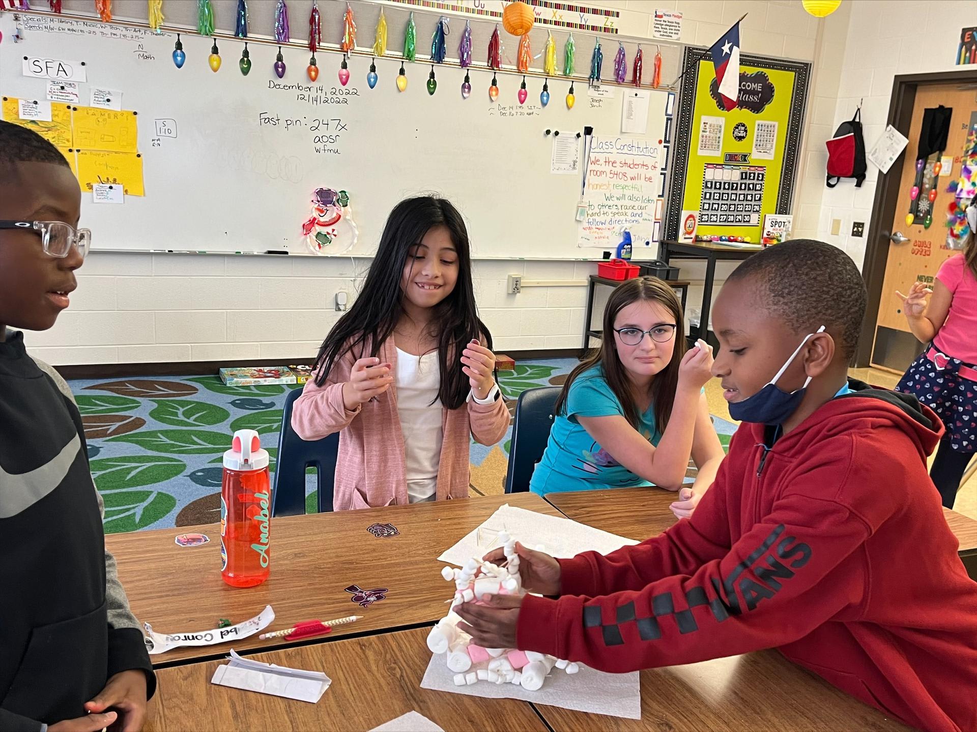 Using marshmallows and toothpicks, students are expected to create the tallest standing snowman! Team work is KEY! |