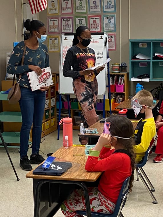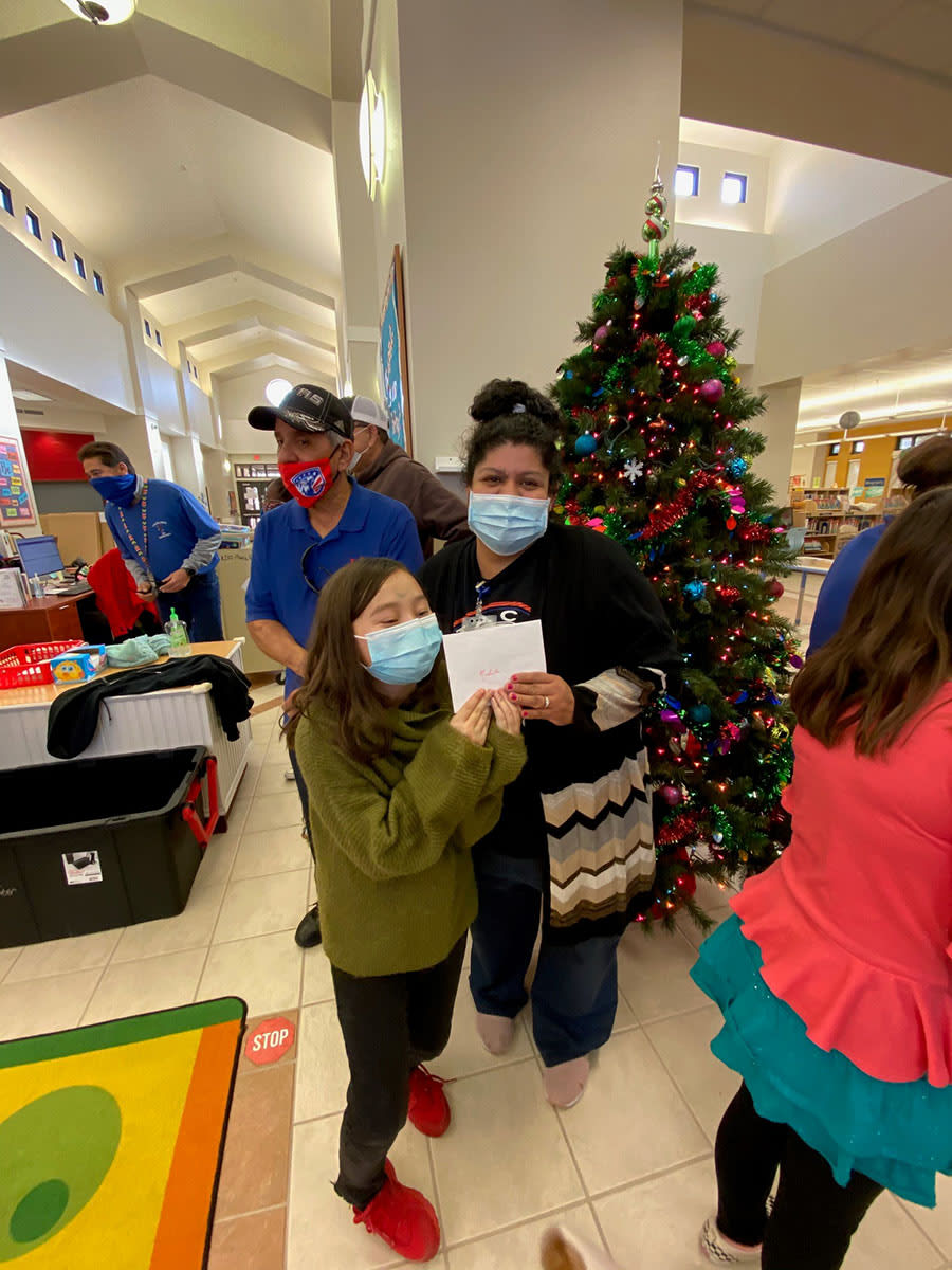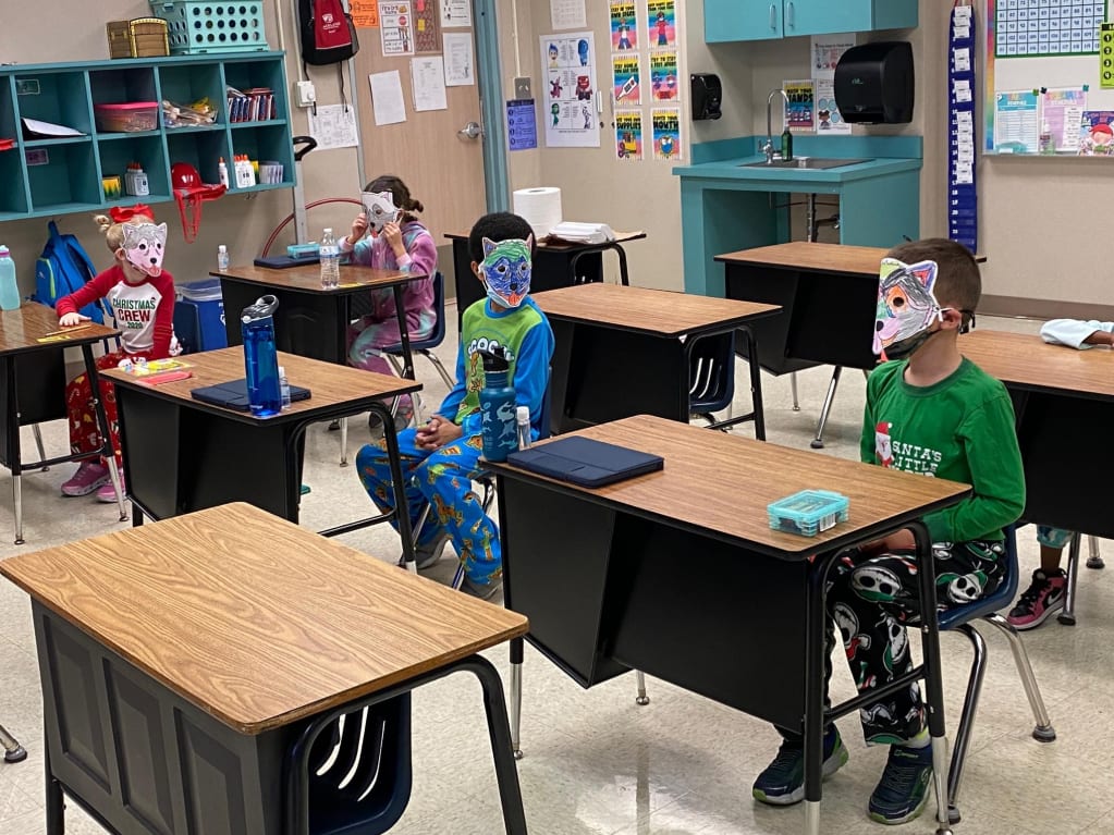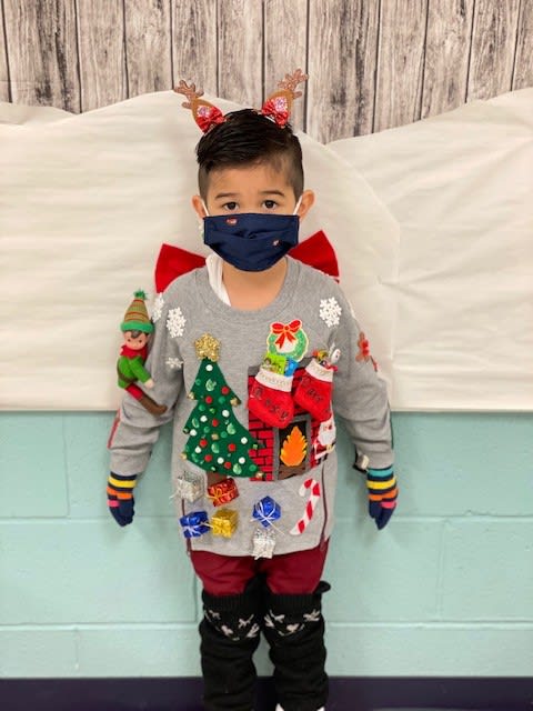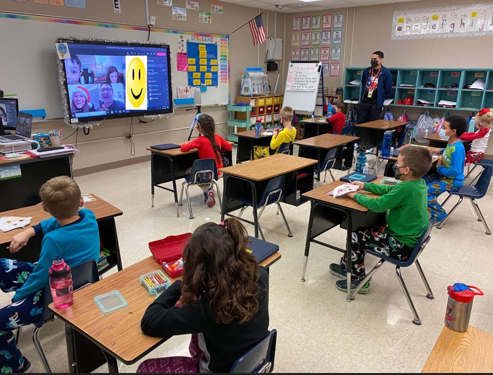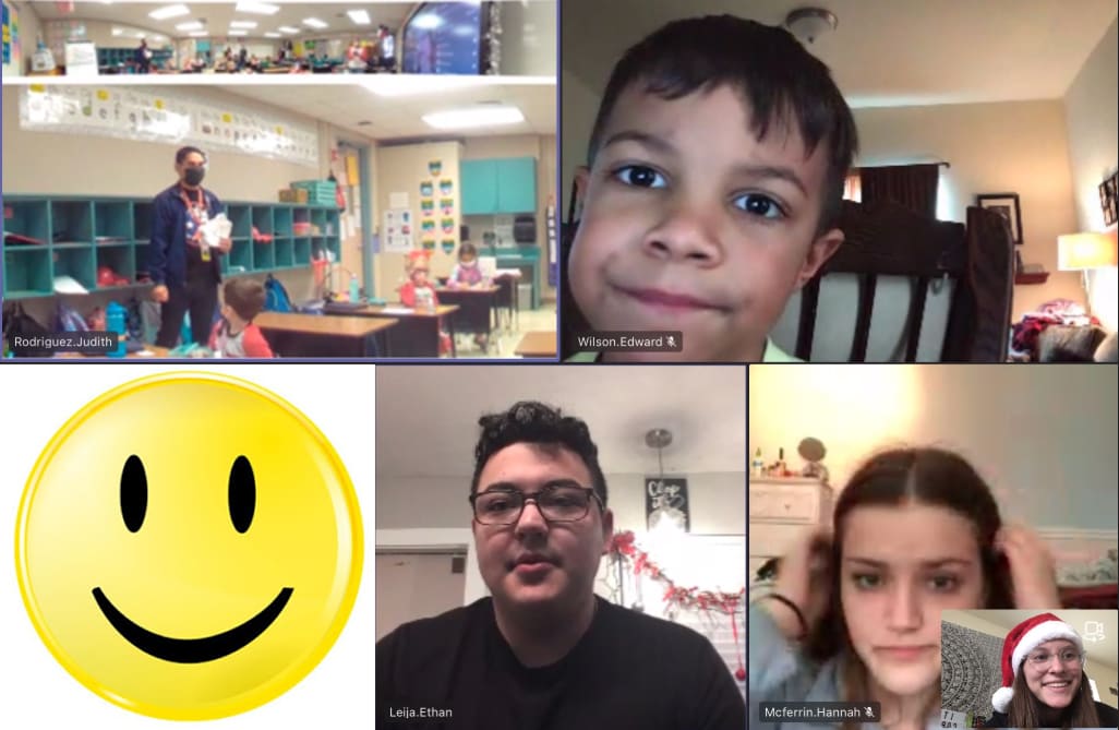 Ms. Duron's Community Service Class visited Ms. Rodriguez’s first grade class. Virtual and in-person learners were able to share their favorite holiday jokes and riddles. They colored in husky masks which were worn when they pretended to be Jingle the dog, the main character of the story. The high school students read “Jingle All the Way” by Tom Shay-Zapien. The story is about a little husky dog and his holiday adventures.