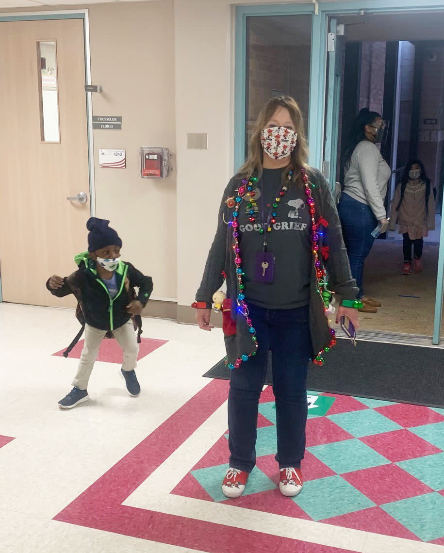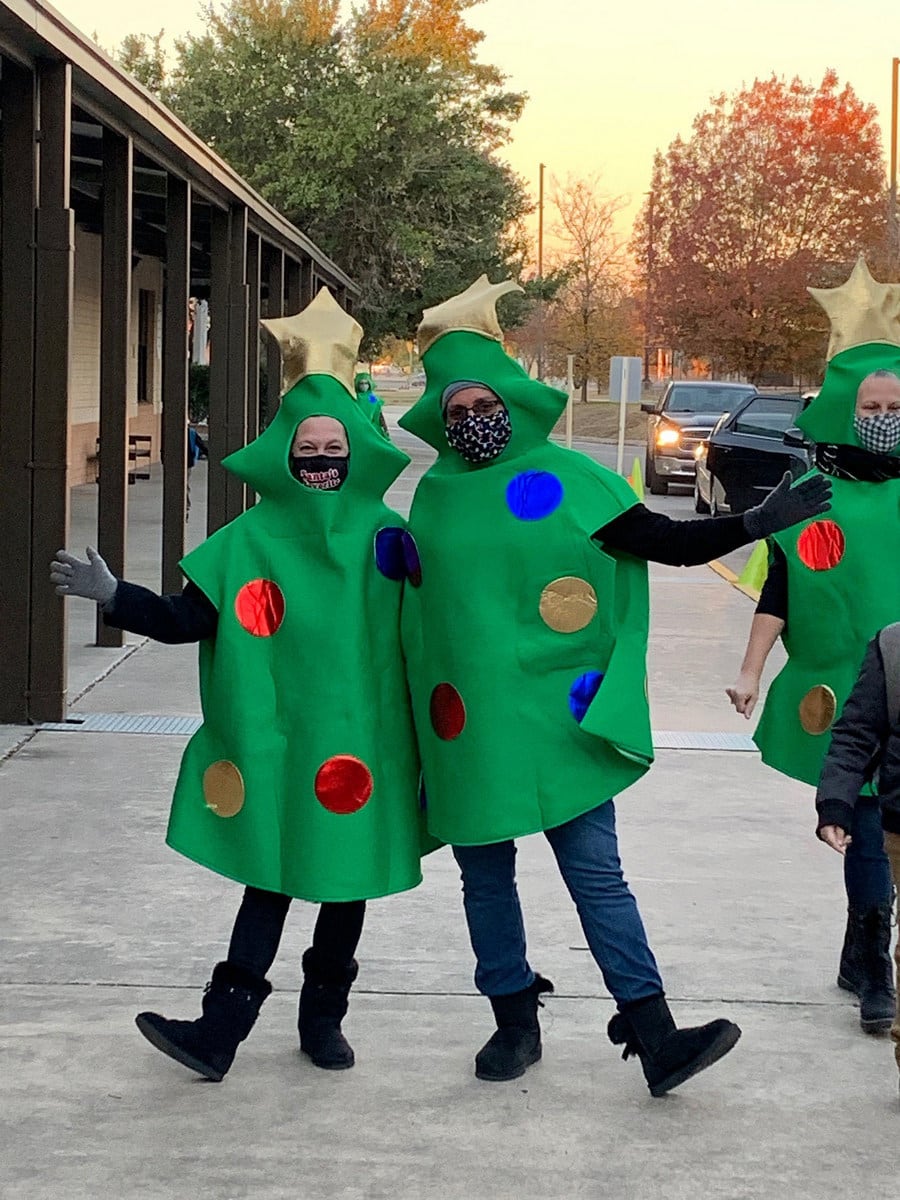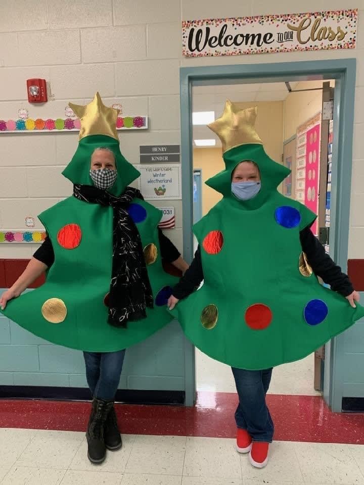 A Christmas tree forest Several Pre/K, Kinder teachers and paraprofessionals dressed as Christmas trees to greet kids being dropped off in the morning! So sweet!