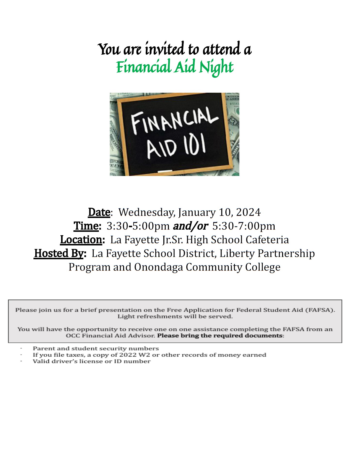 The LaFayette Central School District is collaborating with the Liberty Partnership Program and the Onondaga Community College to host a "Financial Aid Night" workshop for parents and students. There will be two sessions, both held on Wednesday, Jan. 10, 2024 at the junior/senior high school cafeteria. The first will be from 3:30 - 5 p.m., and the second from 5:30 - 7 p.m.This brief presentation will focus on the Free Application for Federal Student Aid (known more colloqually as "FAFSA") process, and offer one-on-one assistance to work through the application with a financial advisor.