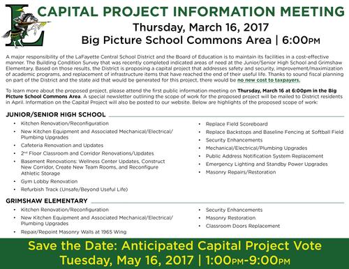 March 20, 2017: In May, LaFayette Central School District residents will have the opportunity to vote on a capital project that addresses improvements and safety and security upgrades at three of the district’s facilities.