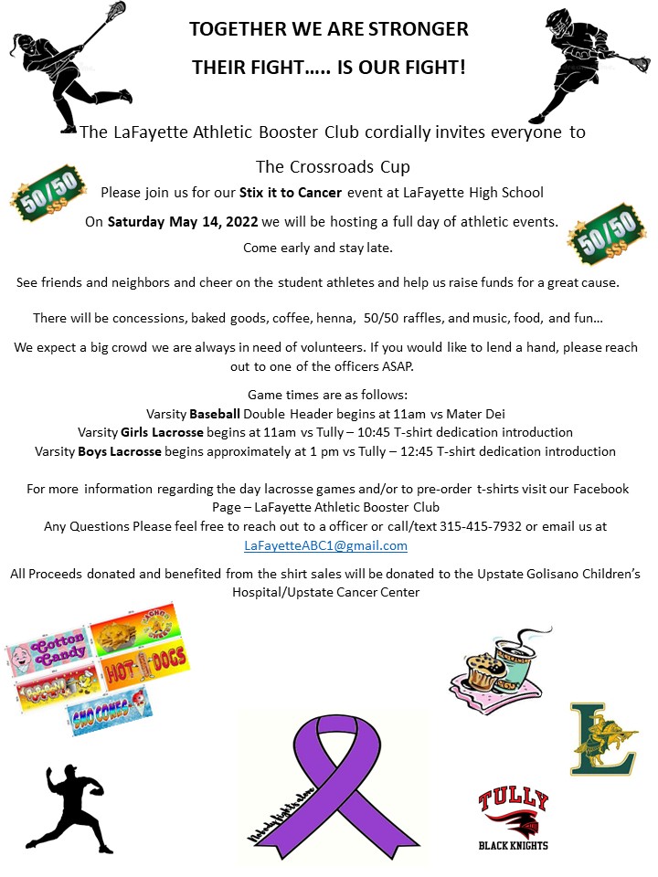 The LaFayette Athletic Booster Club invites the community to attend the “Stix it to Cancer” event at the LaFayette High School on Saturday, May 14, where the school will play host to the “Crossroads Cup.” This full-day event will be home to a variety of athletic contests, including a varsity baseball double-header, and both a girls’ and boys’ lacrosse matchup!