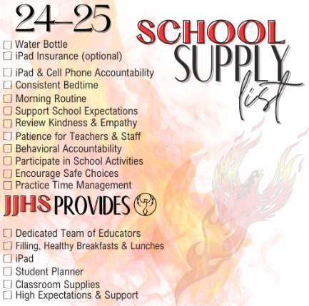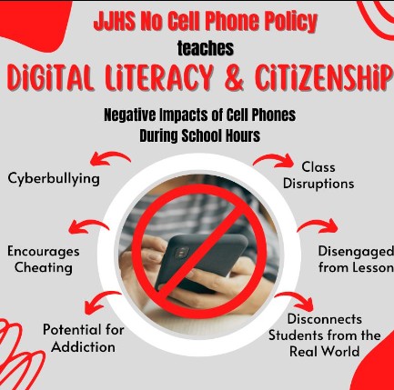 Good afternoon, Firebird Family. We have been contacting families regarding our No Cell Phone, No Weapons, and Backpack Policies. Guardians need to sign and return these documents to confirm you are aware of these important policies. Cell phones are NOT allowed between 7:40 am and 2:44 pm. This includes lunchtime. Students are required to store their cell phone, air pods, backpack, and other personal electronic devices in their locker. JJHS staff are NOT responsible for lost, stolen or damaged cell phones, air pods, backpacks, and other personal electronic devices. Our Cell Phone Policy teaches our Firebirds digital literacy and citizenship. There are many negative impacts that cell phones can have to a student's education and others. If an emergent situation should ever arise, we will promptly let all guardians know via Remind. If a guardian needs to get ahold of their student, they can call the office and we will get the message to them as soon as possible. Repeat occurrences may warrant disciplinary action. All students need at Johnson during the day is their iPad and a water bottle. Everything else is provided in each classroom for them to get their needs met. Backpacks cause a safety issue when in the classroom as we don't have room to store them. The possession of any weapon on school district property is a violation of board policy and the student will be subject to suspension or expulsion up to one year. Thank you for your cooperation with making Johnson a safe and orderly environment for EVERY student by promoting these policies with your students at home. For any questions or concerns, please call and ask to speak to an administrator.