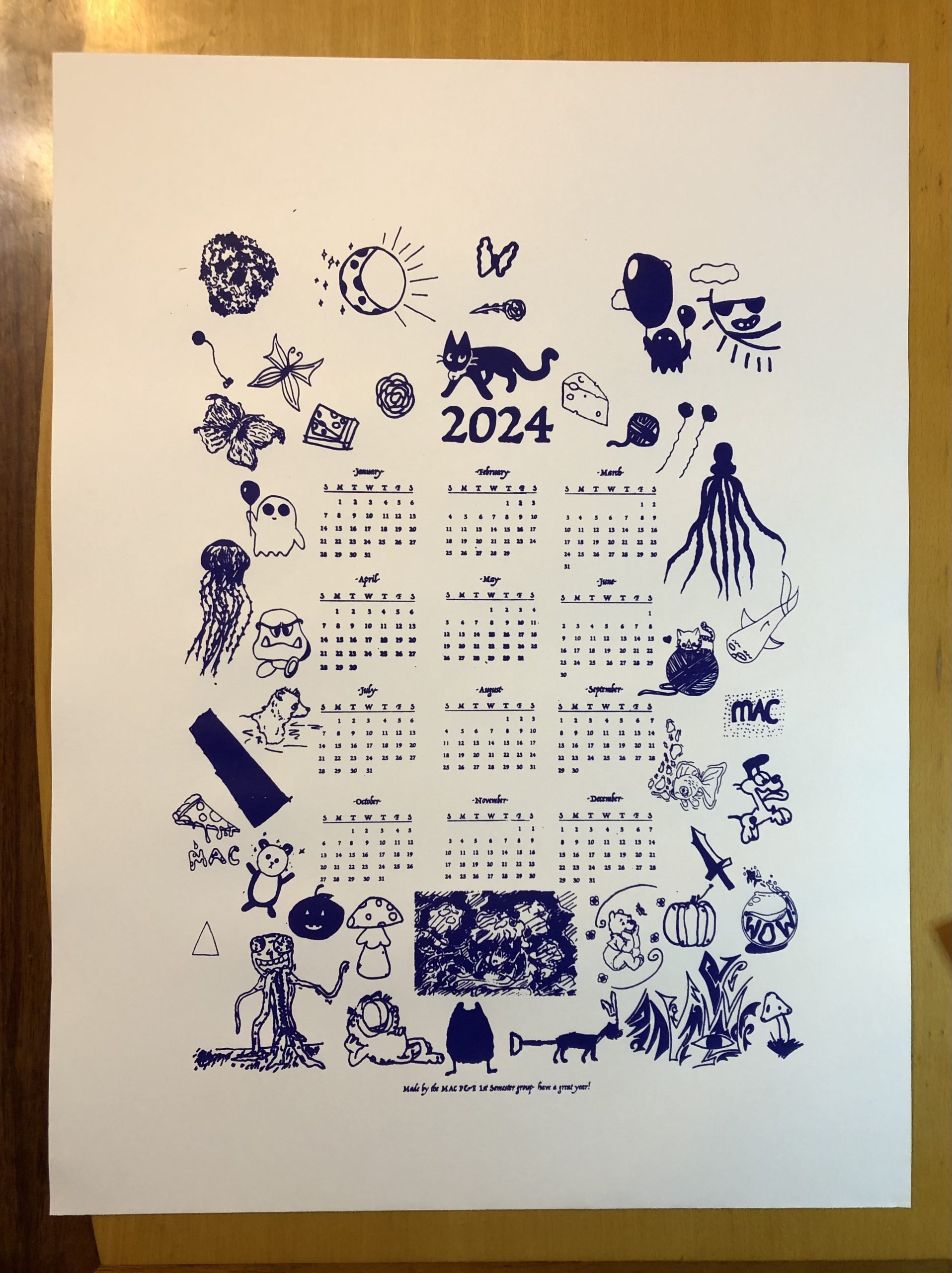 The MAC P&E is very excited to offer our single page 2024 calendar to add a bit of fun for your wall! We are proud to say that each P&E student contributed a drawing to this calendar, creating the varied and unique design. Students will hand print using a silkscreen and water based ink onto a sheet of 18″ x 24″ multi media paper. Calendars will only be made to order and will be printed the last week of school in December.