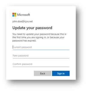 3. If prompted update your password. Enter your current password, your new password, and click “Sign In”. It must be 8 characters long and contain at least one capital letter, one lower case letter, and one number.
