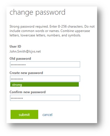 2. Enter your current password, your new password, and click “Submit”. It must be 8 characters long and contain at least one capital letter, one lower case letter, and one number.