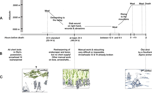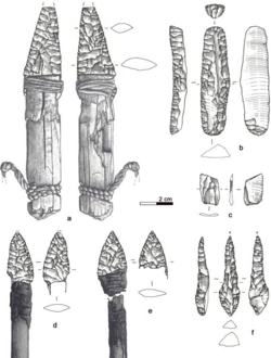 - ^ Wierer, U., Arrighi, S., Bertola, S., Kaufmann, G., Baumgarten, B., Pedrotti, A., Pernter, P. and Pelegrin, J. (2018) "The Iceman's lithic toolkit: Raw material, technology, typology and use". PLOS ONE, 13(6): e0198292. doi:10.1371/journal.pone.0198292 The original caption in Wierer et al. read "The Iceman lithic assemblage. a) Dagger, b) Endscraper, c) Borer, d) Arrowhead 14, e) Arrowhead 12, f) Small flake." The text of Wierer et al.'s paper makes it clear that this a typo and the labels for the borer and small flake have been swapped. e.g.: "The 48.5 mm long artefact known as a borer has its maximum thickness at its maximum width (7.8 x 13.5 mm) (Fig 1F)" and "The smallest item contained in the belt poach is a small flake of 19 x 12.5 x 1.6 mm size (Fig 1C)".