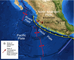Much of Mexico's volcanic and seismic activity stems from the movement of the North American plate against the Cocos and Pacific plates and it is one of the most active trenches in the world.[3] Each year more than 90 tremors above magnitude 4.0 are recorded in this zone.[5]
