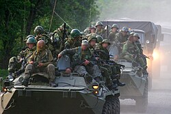 [edit]There were 37 conflicts in 2008 that resulted in at least 25 fatalities, five of which resulted in at least 1,000 fatalities: the Iraqi insurgency, the Taliban insurgency, conflict with the Pakistani Taliban, Eelam War IV in Sri Lanka, and the Somali Civil War.[8][9] A border conflict broke out for two days between Djibouti and Eritrea, ending with Eritrean occupation of the disputed area, Ras Doumeira. This was the first conflict in four years where two sovereign states fought each other directly.[10] The Russo-Georgian War occurred in August when Georgia engaged in warfare with the breakaway state South Ossetia following a series of skirmishes. Russia backed South Ossetia and sent 10,000 soldiers into the fight, progressing further into Georgia until a ceasefire was established.[11] Two separatist rebel groups escalated conflict in India: Dima Halam Daogah sought a Dimasa state and the United National Liberation Front sought an Islamic state.[12]