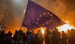 A string of protests and legal challenges against the election outcome took place in the following months and escalated on 28 November when the ruling party announced that, contrary to its election promises, it would "suspend" the European Union accession process until the end of 2028. This decision occurred against the background of Georgians' high levels of trust in the EU.[24]