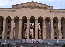 Later, outrage erupted after riot police were let into Tbilisi State University and used it as a staging ground for dispersing peaceful protesters on 19 November, sparking accusations that the university was enabling the crackdown. Student Movements and lecturers demanded the Rector's resignation, accusing TSU of betraying academic values. While the Interior Ministry denied using TSU as a base, protests and condemnation from professors and students across Georgia continued, highlighting TSU's alleged lack of independence under the Georgian Dream government.[55] Several activists and students from different universities entered TSU's main campus as part of the ongoing protest and started a strike demanding resignation.[56] The new parliament held its inaugural session on 25 November, with only 88 MPs from Georgian Dream in attendance. President Zourabichvili boycotted the session, while protests continued outside the parliament building.[57] Constitutional experts said the self-inauguration of Parliament without the president calling this session is in violation of the constitution, challenging the legitimacy of parliament and calling it a "power grab".[58][59] According to the Georgian constitution, it is the president's task to call the inaugural session of parliament. She refused to do so as she rejected the election results as rigged, questioning the legitimacy of parliament.[60] President Zourabichvili called the convocation of parliament "unconstitutional",[61] while the chair of the parliament Shalva Papuashvili accused Zourabichvili of violating constitution in response, saying that according to constitution the new parliament must be convened no later than 10 days after official announcement of results by the Central Election Commission.[62]