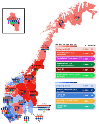 The red-green bloc won a majority with 88 seats,[6] allowing Støre to continue as Prime Minister in his minority government.[7][8] The victory came after years of poor opinion polling, after which the Labour Party made a political comeback. Issues in the election included taxes, immigration, foreign relations, healthcare, and rising inequality.[9][10][11]