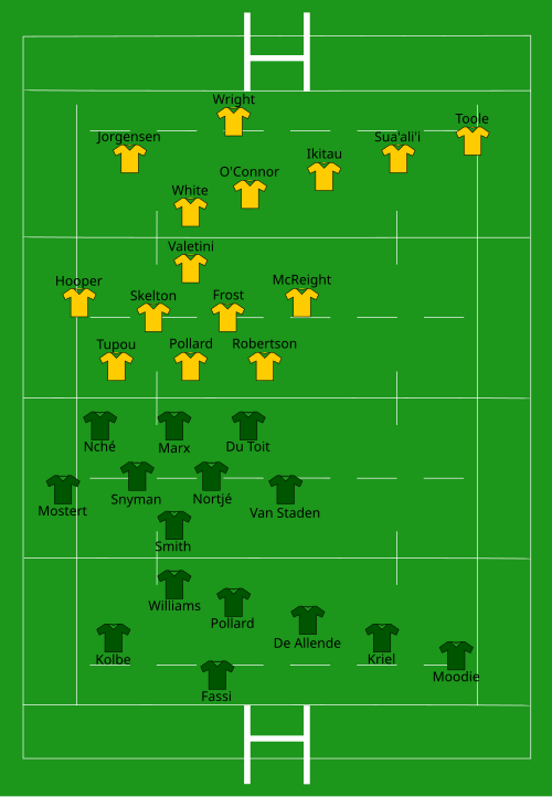 | Try: Moodie 10' c Smith 34' c Etzebeth 73' c Con: Pollard (3/3) 11', 35', 74' Pen: Pollard (3/3) 1', 5', 56' | Report | Try: Toole 7' c Jorgensen 46' c Paenga-Amosa 67' m Con: O'Connor (2/3) 8', 47' Pen: O'Connor (1/3) 40' |