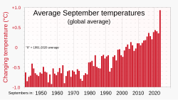 - ^ "Copernicus: September 2023 – unprecedented temperature anomalies; 2023 on track to be the warmest year on record". climate.copernicus.eu. Copernicus Programme. 5 October 2023. Archived from the original on 5 October 2023.