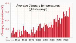 [edit]- 10 January: a summary from the Copernicus Climate Change Service stated that 2024 was the warmest year since records began in 1850, with an average global surface temperature reaching 1.6 °C above pre-industrial levels, surpassing for the first time the 1.5 °C warming target set by the Paris Agreement. The summary also stated that 2024 was the second consecutive year with the hottest global temperature, surpassing 2023 by +0.12 °C.[10]