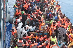 In 2014, 170,100 illegal migrants were recorded arriving in Italy by sea (an increase from 42,925 arrivals recorded in 2013), 141,484 of them leaving from Libya.[19] Most of them came from Syria, the Horn of Africa and West Africa.[20][21]