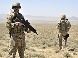 In 1939, Italy under Benito Mussolini launched a military invasion of Albania, resulting in the exile of Zog and the creation of an Italian protectorate.[94][95] As World War II progressed, Italy aimed to expand its territorial dominion in the Balkans, including territorial claims on regions of Greece (Chameria), Macedonia, Montenegro and Kosovo. These ambitions laid the foundation of Greater Albania, which aimed to unite all areas with Albanian-majority populations into a single country.[96] In 1943, as Italy's control declined, Nazi Germany assumed control of Albania, subjecting Albanians to forced labour, economic exploitation and repression under German rule.[97] The tide shifted in 1944 when Albanian partisan forces, under the leadership of Enver Hoxha and other communist leaders, successfully liberated Albania from German occupation.[98]