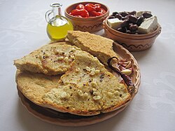 Mesolithic habitation in Albania has been evidenced in several open air sites which during that period were close to the Adriatic coastline and in cave sites. Mesolithic objects found in a cave near Xarrë include flint and jasper objects along with fossilised animal bones, while those discoveries at Mount Dajt comprise bone and stone tools similar to those of the Aurignacian culture.[21] The Neolithic era in Albania began around 7000 BC and is evidenced in finds which indicate domestication of sheep and goats and small-scale agriculture. A part of the Neolithic population may have been the same as the Mesolithic population of the southern Balkans like in the Konispol cave where the Mesolithic stratum co-exists with Pre-Pottery Neolithic finds. Cardium pottery culture appears in coastal Albania and across the Adriatic after 6500 BC, while the settlements of the interior took part in the processes which formed the Starčevo culture.[22] The Albanian bitumen mines of Selenicë provide early evidence of bitumen exploitation in Europe, dating to Late Neolithic Albania (from 5000 BC), when local communities used it as pigment for ceramic decoration, waterproofing, and adhesive for reparing broken vessels. The bitumen of Selenicë circulated towards eastern Albania from the early 5th millennium BC. First evidence of its overseas trade export comes from Neolithic and Bronze Age southern Italy. The high-quality bitumen of Selenicë has been exploited throughout all the historical ages since the Late Neolithic era until today.[23]