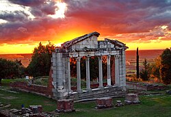 Albania was inhabited by several Illyrian tribes, among them the Ardiaei, Bylliones, Dassaretii, Enchele, and Taulantians, with the Chaonians settled in the southwest. Several colonies were founded by the Ancient Greeks along the Albanian coast, most notably Apollonia. The Illyrians were the dominant power in Albania before the rise of Macedon.[8] Following the Illyrian Wars, Albania was integrated into the Roman Empire and remained in the Byzantine Empire after its partition. During the Middle Ages, several Albanian principalities emerged, most notably the Principality of Arbanon, Kingdom of Albania, Principality of Albania and Albania Veneta. In the 15th century, Albania became a center of resistance against Ottoman expansion under the leadership of Gjergj Kastrioti Skanderbeg, whose military campaigns repelled Ottoman advances for over two decades. Although incorporated into the Ottoman Empire, Albania retained distinct cultural and social identities throughout four centuries of foreign rule, culminating in the Albanian Renaissance in the 19th century. Albania declared independence in 1912, followed by a turbulent 20th century marked by monarchy, foreign occupation during both World Wars, and a repressive communist regime under Enver Hoxha.[9]