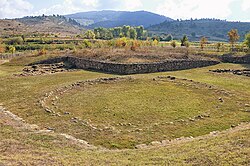 The Indo-Europeanisation of Albania in the context of the IE-isation of the western Balkans began after 2800 BC. The presence of the Early Bronze Age tumuli in the vicinity of later Apollonia dates to 2679±174 calBC (2852-2505 calBC). These burial mounds belong to the southern expression of the Adriatic-Ljubljana culture (related to later Cetina culture) which moved southwards along the Adriatic from the northern Balkans. The same community built similar mounds in Montenegro (Rakića Kuće) and northern Albania (Shtoj).[24] The first archaeogenetic find related to the IE-isation of Albania involves a man with predominantly Yamnaya ancestry buried in a tumulus of northeastern Albania which dates to 2663–2472 calBC.[25] During the Middle Bronze Age, Cetina culture sites and finds appear in Albania. Cetina culture moved southwards across the Adriatic from the Cetina valley of Dalmatia. In Albania, Cetina finds are concentrated around southern Lake Shkodër and appear typically in tumulus cemeteries like in Shkrel and Shtoj and hillforts like Gajtan (Shkodër) as well as cave sites like Blaz, Nezir and Keputa (central Albania) and lake basin sites like Sovjan (southeastern Albania).[26]