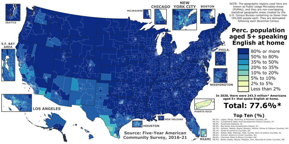 In 2021, about 245 million Americans, aged 5 or above, spoke English at home: a majority of the United States total population of roughly 330 million people.[72]