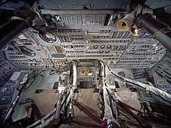 The command module (CM) was the conical crew cabin, designed to carry three astronauts from launch to lunar orbit and back to an Earth ocean landing. It was the only component of the Apollo spacecraft to survive without major configuration changes as the program evolved from the early Apollo study designs. Its exterior was covered with an ablative heat shield, and had its own reaction control system (RCS) engines to control its attitude and steer its atmospheric entry path. Parachutes were carried to slow its descent to splashdown. The module was 11.42 feet (3.48 m) tall, 12.83 feet (3.91 m) in diameter, and weighed approximately 12,250 pounds (5,560 kg).[53]