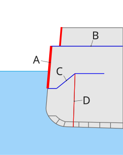 Typically, the belt covers from the deck down some way below the waterline of the ship. If built within the hull, rather than forming the outer hull, it can be fitted at an inclined angle to improve the protection.