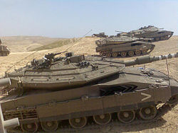 [edit]The most heavily armoured vehicles today are the main battle tanks, which are the spearhead of the ground forces, and are designed to withstand anti-tank guided missiles, kinetic energy penetrators, high-explosive anti-tank weapons, NBC threats and in some tanks even steep-trajectory shells. The Israeli Merkava tanks were designed in a way that each tank component functions as added back-up armour to protect the crew. Outer armour is modular and enables quickly replacing damaged parts.