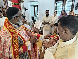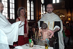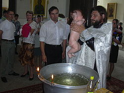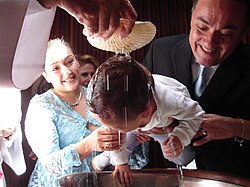 Baptism (from Koine Greek: βάπτισμα, romanized: váptisma, lit. 'immersion, dipping in water')[1] is a Christian rite of initiation almost invariably with the use of water.[2][3] It may be performed by sprinkling or pouring water on the head, or by immersing in water either partially or completely, traditionally three times, once for each person of the Trinity.[4][5][6] The synoptic gospels recount that John the Baptist baptized Jesus.[7][8][9][10] Baptism is considered a sacrament in most churches, and as an ordinance in others. Baptism according to the Trinitarian formula, which is done in most mainstream Christian denominations, is seen as being a basis for Christian ecumenism, the concept of unity amongst Christians.[11][12][13] Baptism is also called christening,[14][15] although this is typically reserved for the baptism of infants.[16] In certain Christian denominations, such as the Catholic Churches, Eastern Orthodox Churches, Oriental Orthodox Churches, Assyrian Church of the East, and Lutheran Churches, baptism is the door to church membership, with candidates taking baptismal vows.[17][18] It has also given its name to the Baptist churches and denominations.