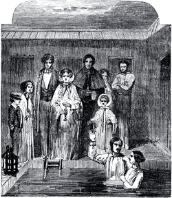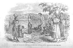 The word submersion comes from the late Latin (sub- "under, below" + mergere "plunge, dip")[61] and is also sometimes called "complete immersion". It is the form of baptism in which the water completely covers the candidate's body. Submersion is practiced in the Orthodox and several other Eastern Churches.[62] In the Latin Church of the Catholic Church, baptism by submersion is used in the Ambrosian Rite and is one of the methods provided in the Roman Rite of the baptism of infants.[63] It is seen as obligatory among some groups that have arisen since the Protestant Reformation, such as Baptists.[64]
