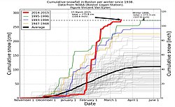 [edit]Prior to European colonization, the region surrounding present-day Boston was inhabited by the Massachusett people who established small, seasonal communities in present-day Boston.[36][37] In 1630, settlers led by John Winthrop arrived, and found Shawmut Peninsula nearly empty of Native people. Most had died of European diseases borne by earlier settlers and traders.[38][39] Archaeological excavations have unearthed one of the oldest fishweirs in New England, located on Boylston Street, which Native people constructed as early as 7,000 years before European arrival in the Western Hemisphere.[37][36][40]