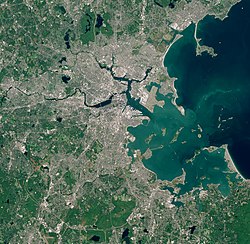 Boston has an area of 89.63 sq mi (232.1 km2). Of this area, 48.4 sq mi (125.4 km2), or 54%, of it is land and 41.2 sq mi (106.7 km2), or 46%, of it is water. The city's elevation, as measured at Logan International Airport, is 19 ft (5.8 m) above sea level.[112] The highest point in Boston is Bellevue Hill at 330 ft (100 m) above sea level, and the lowest point is at sea level.[113] The city is adjacent to Boston Harbor, an arm of Massachusetts Bay, and by extension, the Atlantic Ocean.