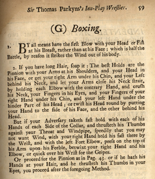 Early fighting had no written rules, weight divisions, round limits, or referees. As a result, it was an extremely chaotic and brutal affair. An early article on boxing was published in Nottingham in 1713, by Sir Thomas Parkyns, 2nd Baronet, a wrestling patron from Bunny, Nottinghamshire, who had practised the techniques he described. The article, a single page in his manual of wrestling and fencing, Progymnasmata: The inn-play, or Cornish-hugg wrestler, described a system of headbutting, punching, eye-gouging, chokes, and hard throws, not recognized in boxing today.[22]