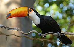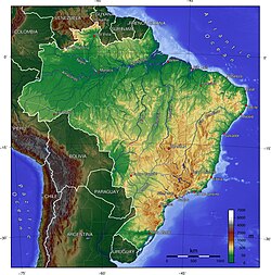 Bounded by the Atlantic Ocean on the east, Brazil has a coastline of 7,491 kilometers (4,655 mi).[13] Covering roughly half of South America's land area, it borders all other countries and territories on the continent except Ecuador and Chile.[14] Brazil encompasses a wide range of tropical and subtropical landscapes, as well as wetlands, savannas, plateaus, and low mountains. It contains most of the Amazon basin, including the world's largest river system and most extensive virgin tropical forest. Brazil has diverse wildlife, a variety of ecological systems, and extensive natural resources spanning numerous protected habitats.[13] The country ranks first among 17 megadiverse countries, with its natural heritage being the subject of significant global interest, as environmental degradation (through processes such as deforestation) directly affect global issues such as climate change and biodiversity loss.