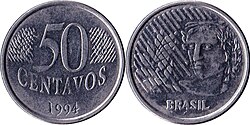 [edit]Along with the first series of currency, coins were introduced in denominations of 1, 5, 10, and 50 centavos and 1 real on June 30, 1994. The 25 centavos piece was soon introduced on September 30, 1994 due to the constant lack of change in intermediate values in the centavos range, which caused the validity of the old Cruzeiro and Cruzeiro Real banknotes to be extended for two months beyond what was initially intended for the exchange of banknotes and coins until then in circulation for the new ones that began to circulate in the second half of 1994.. All were struck in stainless steel.
