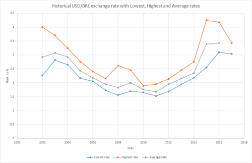 The exchange rate as of September 2015 was US$1=R$4.05. After a period of gradual recovery, it reached US$1=R$3 by February 2017.