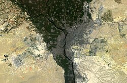 Cairo is located in northern Egypt, known as Lower Egypt, 165 km (100 mi) south of the Mediterranean Sea and 120 km (75 mi) west of the Gulf of Suez and Suez Canal.[154] The city lies along the Nile River, immediately south of the point where the river leaves its desert-bound valley and branches into the low-lying Nile Delta region. Although the Cairo metropolis extends away from the Nile in all directions, the city of Cairo resides only on the east bank of the river and two islands within it on a total area of 453 km2 (175 sq mi).[155][156] Geologically, Cairo lies on alluvium and sand dunes which date from the quaternary period.[157][158]