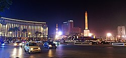 The city was devastated during the 1952 riots known as the Cairo Fire or Black Saturday, which saw the destruction of nearly 700 shops, movie theatres, casinos and hotels in downtown Cairo.[136] The British departed Cairo following the Egyptian Revolution of 1952, but the city's rapid growth showed no signs of abating. Seeking to accommodate the increasing population, President Gamal Abdel Nasser redeveloped Tahrir Square and the Nile Corniche, and improved the city's network of bridges and highways.[137] Meanwhile, additional controls of the Nile fostered development within Gezira Island and along the city's waterfront. The metropolis began to encroach on the fertile Nile Delta, prompting the government to build desert satellite towns and devise incentives for city-dwellers to move to them.[138]