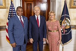 As large parts of the country were at the time controlled by armed groups, the election could not be conducted in many areas of the country.[80][81] Some 800 of the country's polling stations, or 14% of the total, were closed due to violence.[82] Three Burundian peacekeepers were killed and an additional two were wounded during the run-up to the election.[83][84] President Faustin-Archange Touadéra was reelected.[85] Russian mercenaries from the Wagner Group have supported President Faustin-Archange Touadéra in the fight against rebels. Russia's Wagner group has been accused of harassing and intimidating civilians.[86][87] In December 2022, Roger Cohen wrote in The New York Times, "Wagner shock troops form a Praetorian Guard for Mr. Touadéra, who is also protected by Rwandan forces, in return for an untaxed license to exploit and export the Central African Republic's resources" and "one Western ambassador called the Central African Republic...a 'vassal state' of the Kremlin."[88]