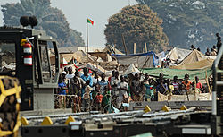 [edit]Patassé purged many of the Kolingba elements from the government and Kolingba supporters accused Patassé's government of conducting a "witch hunt" against the Yakoma. A new constitution was approved on 28 December 1994 but had little impact on the country's politics. In 1996–1997, reflecting steadily decreasing public confidence in the government's erratic behavior, three mutinies against Patassé's administration were accompanied by widespread destruction of property and heightened ethnic tension. During this time (1996), the Peace Corps evacuated all its volunteers to neighboring Cameroon. To date, the Peace Corps has not returned to the Central African Republic. The Bangui Agreements, signed in January 1997, provided for the deployment of an inter-African military mission, to the Central African Republic and re-entry of ex-mutineers into the government on 7 April 1997. The inter-African military mission was later replaced by a U.N. peacekeeping force (MINURCA). Since 1997, the country has hosted almost a dozen peacekeeping interventions, earning it the title of "world champion of peacekeeping".[33]