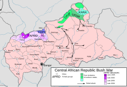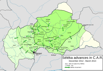 In November 2012, in Obo, FACA soldiers were injured in an attack attributed to Chadian Popular Front for Recovery rebels.[72] On 10 December 2012, the rebels seized the towns of N'Délé, Sam Ouandja and Ouadda, as well as weapons left by fleeing soldiers.[73][74][75] On 15 December, rebel forces took Bamingui, and three days later they advanced to Bria, moving closer to Bangui. The Alliance CPSK-CPJP for the first time used the name Séléka (meaning "union" in the Sango language) with a press release calling itself "Séléka CPSK-CPJP-UFDR", thus including the Union of Democratic Forces for Unity (UFDR).[76] The Séléka claim they are fighting because of a lack of progress after a peace deal ended the Bush War.[77] Following an appeal for help from Central African President François Bozizé, the President of Chad, Idriss Déby, pledged to send 2,000 troops to help quell the rebellion.[78][79] The first Chadian troops arrived on 18 December 2012 to reinforce the CAR contingent in Kaga-Bandoro, in preparation for a counter-attack on N'Délé. Séléka forces took Kabo on 19 December, a major hub for transport between Chad and CAR, located west and north of the areas previously taken by the rebels.[80] On 18 December 2012, the Chadian group Popular Front for Recovery (FPR)[81] announced their allegiance to the Séléka coalition. On 20 December 2012, a rebel group based in northern CAR, the Democratic Front of the Central African People (FDPC) joined the Séléka coalition.[82] Four days later the rebel coalition took over Bambari, the country's third largest town,[83] followed by Kaga-Bandoro on 25 December.[84] Rebel forces reached Damara, bypassing the town of Sibut where around 150 Chadian troops were stationed together with CAR troops that withdrew from Kaga-Bandoro.