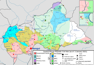 On 3 January 2021, MINUSCA reported that the rebel coalition partially captured Bangassou, adding that the fighters were allied to former president François Bozizé. It is argued that the arrival of the Rwandans and Russians thwarted the rebels from reaching Bangui and so the rebels adopted a long-term strategy of suffocating Bangui by controlling the resources around it,[207] however, on 13 January, the CPC attacked the capital but were eventually repelled.[208]