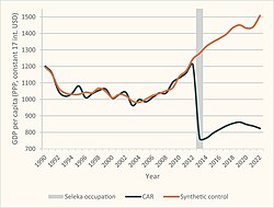In comparison to other conflicts analyzed using similar methods, the economic cost of the CAR civil war ranks among the highest in terms of relative GDP per capita decline.[262] Moreover, the estimates surpass the economic costs of the Rwandan genocide—derived from another statistical methodology—which were estimated to reach between 25 and 30 percent of per capita GDP one decade after,[263] which seems striking given the humanitarian cost of this event.